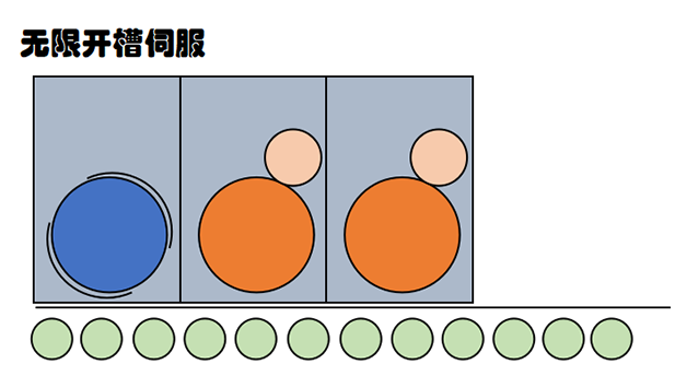 無限開槽應(yīng)用在瓦楞紙水墨印刷機(jī)的后段,開槽部分。主要實(shí)現(xiàn)的是成產(chǎn)紙板長度大于開槽周長的超長箱型,運(yùn)動控制采取凸輪動作來實(shí)現(xiàn)該效果。